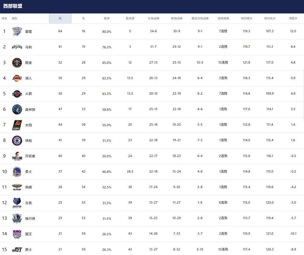 在又一个比赛结束后,随着雷霆、马刺、掘金、太阳赢球,森林狼输球,西部前十排名逐渐明朗,前十中已经有一半锁定位置,最新排名如下。