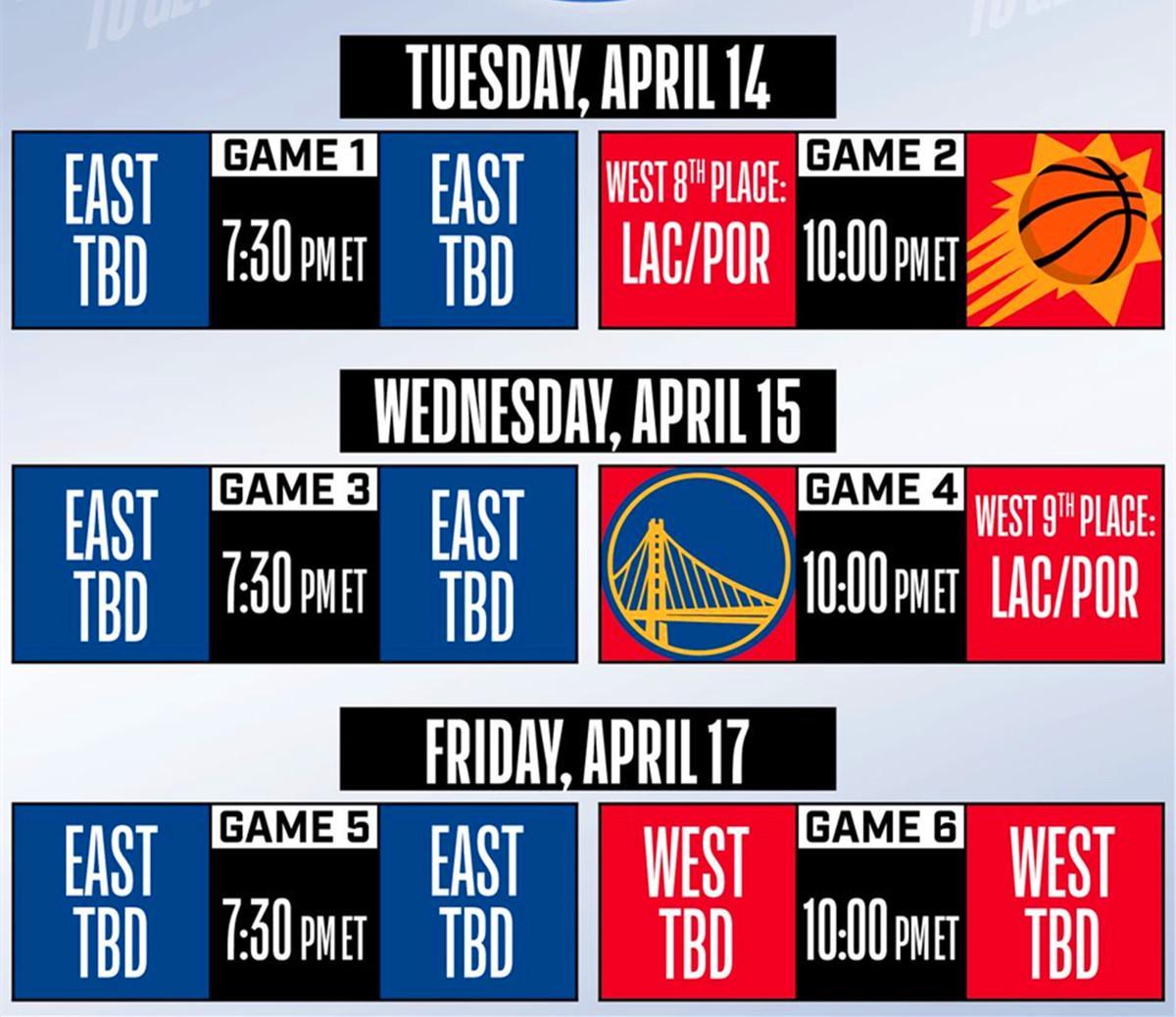 4月15日:G1 | 东部第八vs东部第七(早7点半)、G2 | 西部第八(快船/开拓者)vs太阳(早10点);